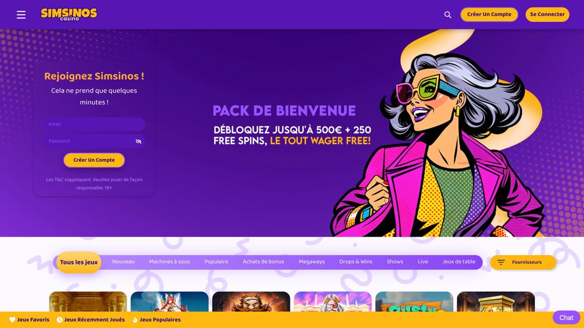 Lancé en 2022, Simsinos fait partie des casinos qui cherchent à se distinguer visuellement avec un univers pop art très affirmé. Le site combine jeux de casino, paris sportifs et quelques angles promotionnels plus agressifs que la moyenne.