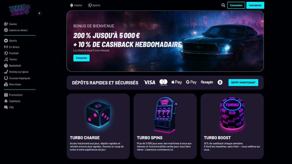 En 2025, Turbo Wins entre en piste avec une idée simple : miser sur la vitesse et l’efficacité. Pas de décor tape-à-l’œil ni d’univers grandiloquent, ici tout est pensé pour aller droit au but... Mais de façon responsable. Une interface épurée, des jeux classiques, des paris en ligne et un accès rapide à toutes les sections, le site a travaillé sur l’essentiel.